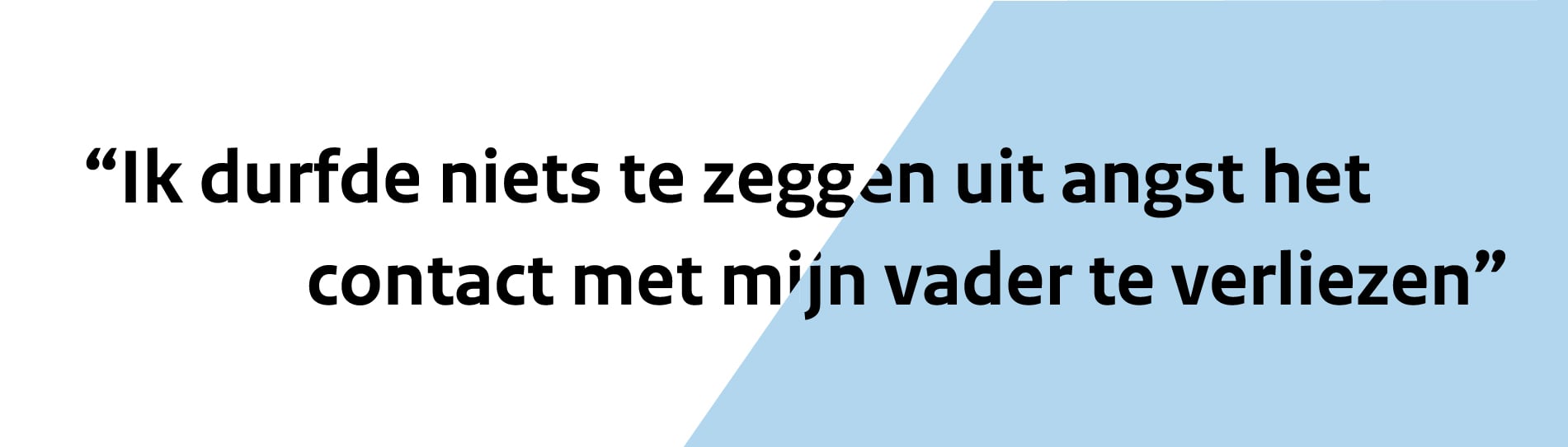 "Op een gegeven moment ga je toch aan jezelf twijfelen, zie ik het allemaal nog wel goed? Ik schaamde me, maar besprak ik de situatie toch met een aantal mensen in mijn directe omgeving, waaronder professionals uit de zorg. Dat hielp. Door die gesprekken wist ik dat ik openheid van zaken moest eisen. Dat ik in gesprek wilde met mijn familie over de situatie zorgde er uiteindelijk voor dat mijn zwager een verklaring opstelde. Daarin stond dat mijn vader geen contact meer met mij of mijn gezin wil. Gelukkig hebben we stiekem toch contact gehouden, en bleek uit niets dat hij geen contact meer met mij wilde.